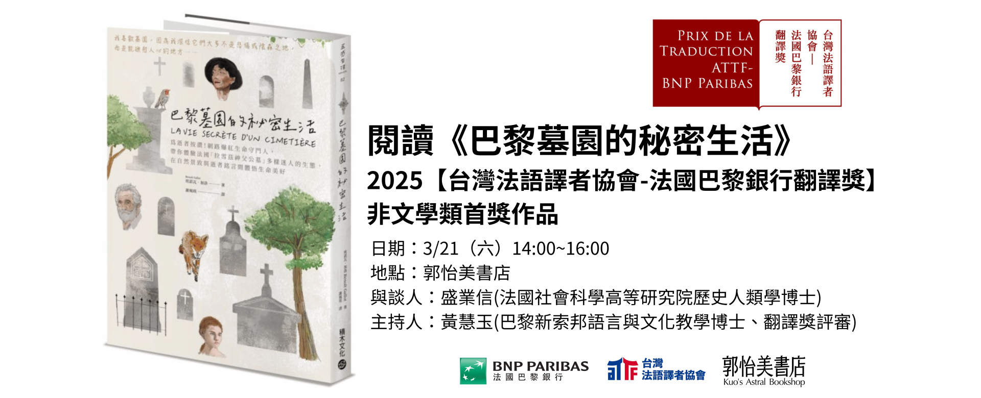 2025年【台灣法語譯者協會–法國巴黎銀行翻譯獎】非文學類首獎公布台灣法語譯者協會今日宣布2025年【台灣法語譯者協會–法國巴黎銀行翻譯獎】非文學類由謝珮琪女士以譯作《巴黎墓園的祕密生活》拿下首獎。 -