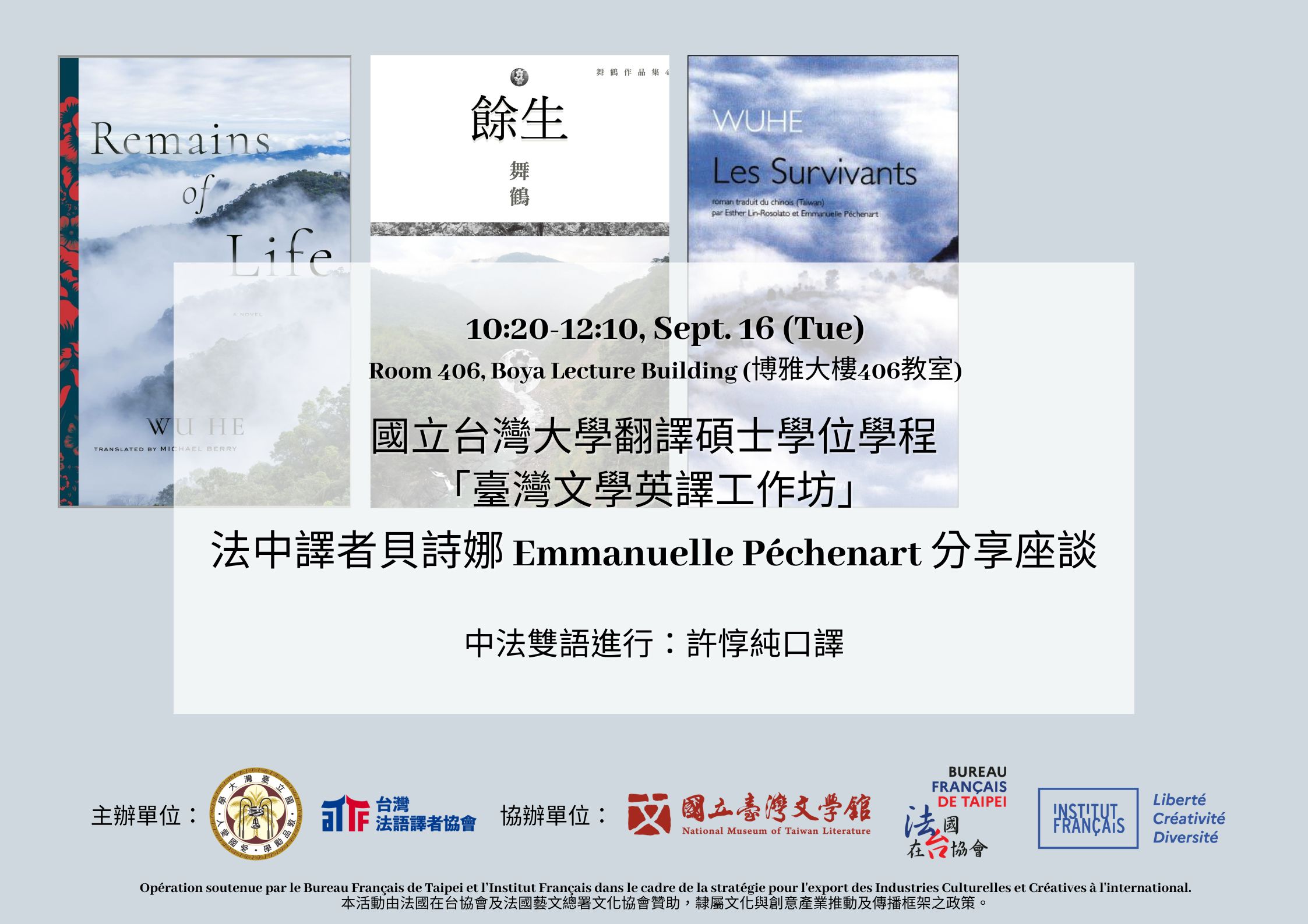 Emmanuelle Péchenart, tutrice du “Vice-Versa Taïwan", participe à l’“Atelier de traduction de la littérature taïwanaise en anglais” du master de traduction de l’Université Nationale de Taïwan le 16 septembre. Cette conférence sera traduite par Tun-Chun Hsu, membre du conseil d’administration de l'ATTF.